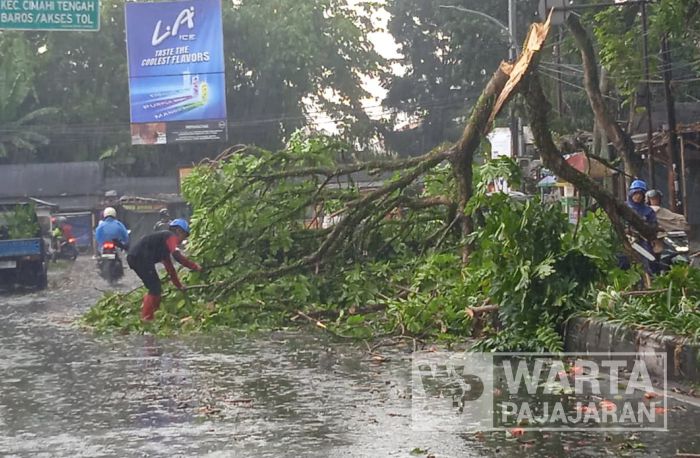 Pohon tumbang terjadi bersamaan dengan hujan deras disertai angin kencang mengguyur wilayah Kota Cimahi pada sekira pukul 12.45 WIB.
